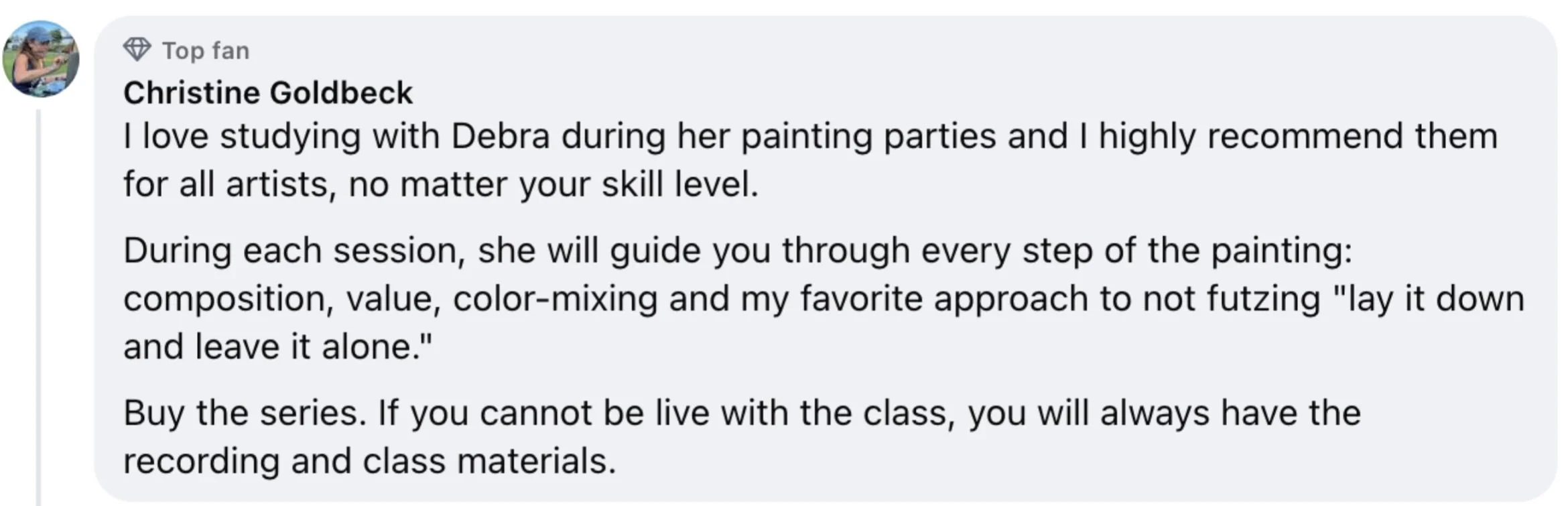I continue to use her methods and teachings on a daily basis when I paint. Her teaching stays with you long after her lessons and videos!